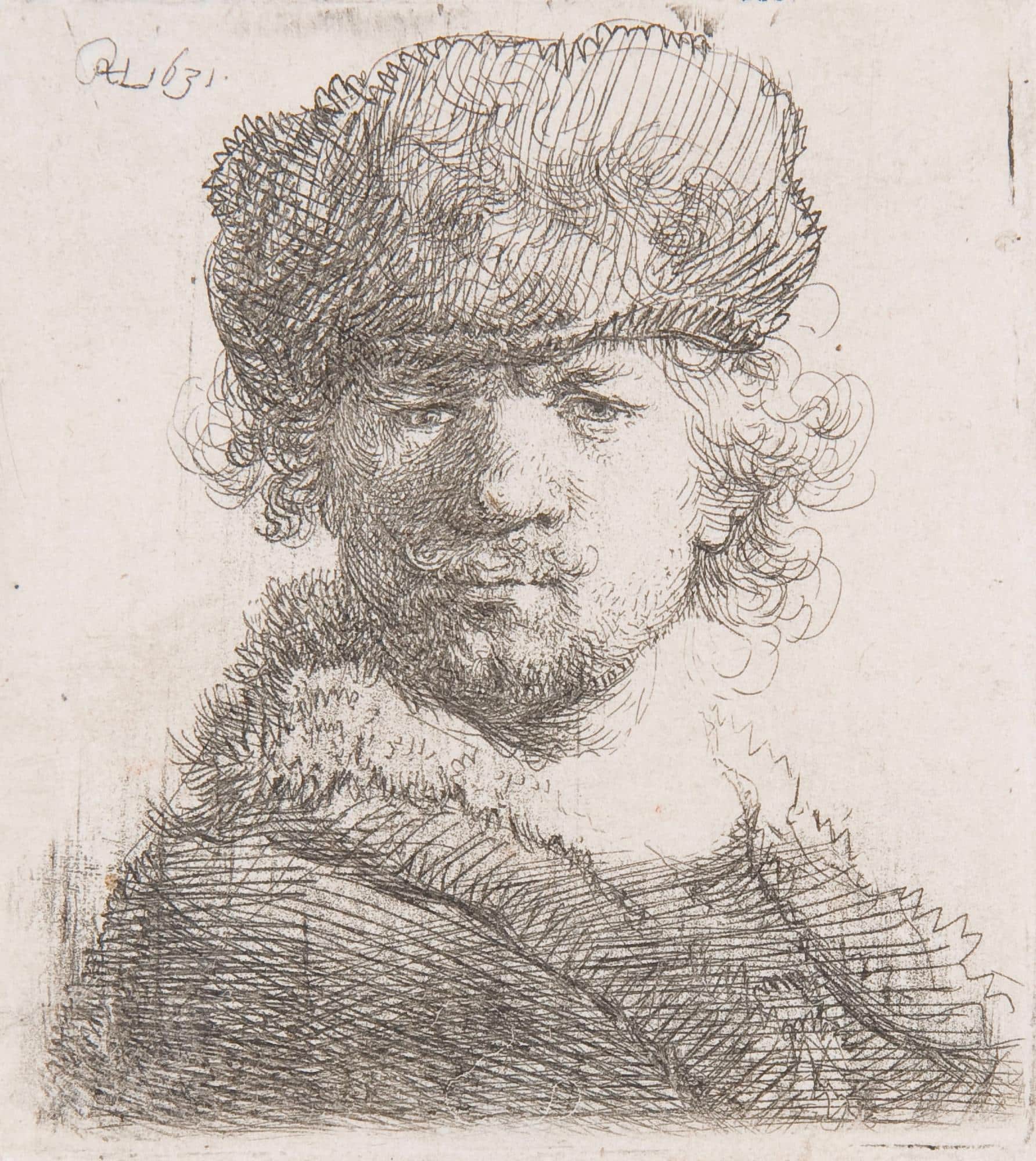 Rembrandt van Rijn (Dutch, 1606 – 1669), Self-portrait in a Heavy Fur Cap, 1631, Etching on paper, Des Moines Art Center Permanent Collections; Gift of Benjamin A. Younker, 1942.9