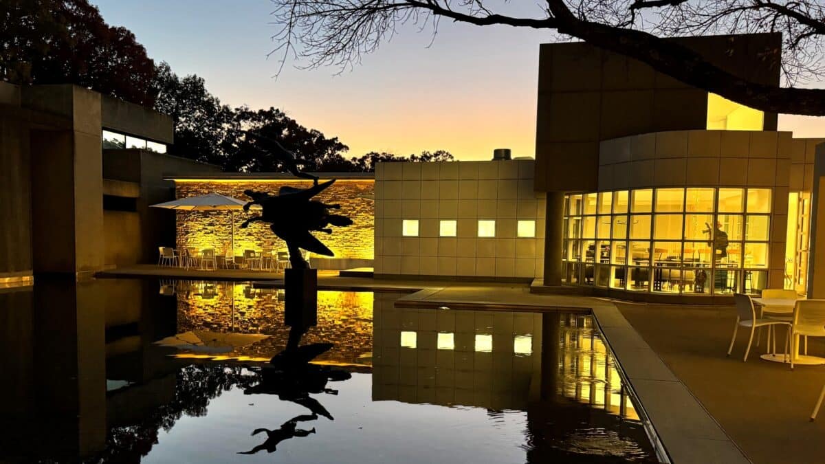 The courtyard features lit trees, a granite reflecting pool, and the iconic sculpture, “Man and Pegasus” (1949) by Carl Milles. It is surrounded by the architecture of Eliel Saarinen, I. M. Pei, and Richard Meier.
